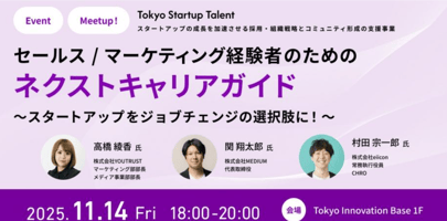 イベント 【登壇のお知らせ】東京都主催「Tokyo Startup Talent」に代表・田尻が登壇します 広報室 2025/10/31 9:59:38 【登壇のお知らせ】東京都主催「Tokyo Startup Talent」に代表・田尻が登壇します 2025年11月14日(木)に開催される、東京都主催のスタートアップ支援イベント「Tokyo... 続きを読む