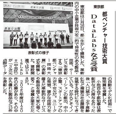 - 2025/11/27 [日刊建設工業新聞] 「ベンチャー技術大賞 東京都小池知事が15社の賞状贈呈」という記事において、DataLabs株式会社が令和7年度「東京都ベンチャー技術大賞」にて特別賞を受賞したことについて紹介されました。