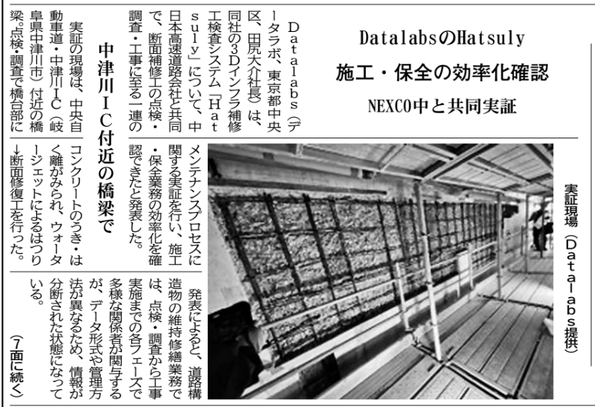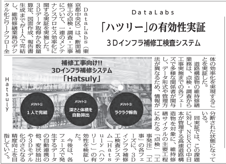 - 2025/11/28 [日刊建設工業新聞] 「データラボ、中日本高速会社 1人で一連の工程完結 道路構造物断面補修 3Dデータ活用の効率化を実証」という記事において紹介されました。