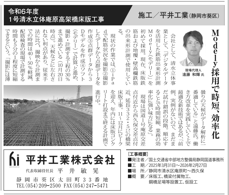 - 2023/12/12 [日刊建設工業新聞] NEXCO中日本との技術実証で「Modely」の有効性を確認したことについて紹介されました。
